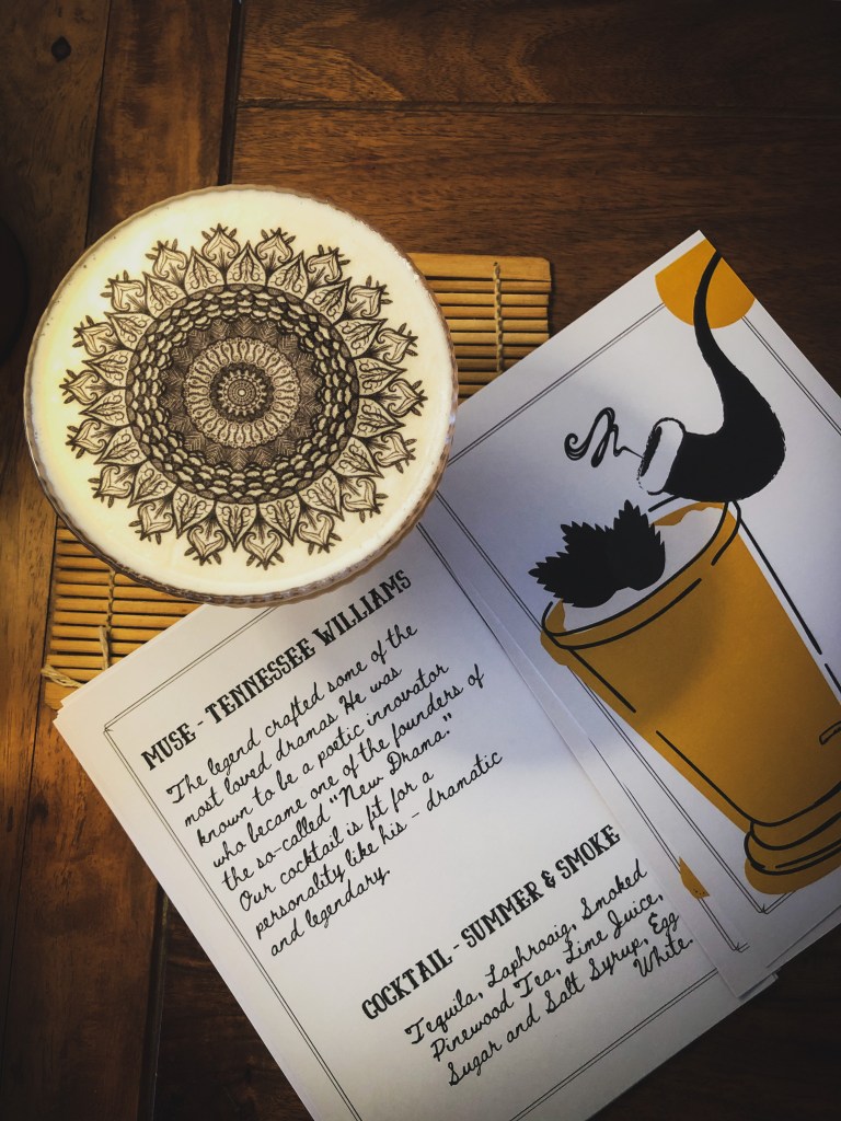 The hero of this menu though, is the Summer & Smoke, attributed to Tennnesee Williams. I’ll admit I’m biased to this drink because of its sheer creativity and presentation. Using Tequila, Scotch Whisky, Smoked Pinewood Tea, and egg white, this drink is dramatically presented with an edible rice paper mandala garnish. A treat for the eyes and the palate, I was able to try this drink at home, thanks to a very neatly put together cocktail kit and recipe card sent over by the team. The drink is perfectly balanced with elements of sweet, saline, sour, and smoke – a powerhouse of flavours that leaves you hankering for more. It is safe to say that this drink is the piece de resistance of this little book of treasures.