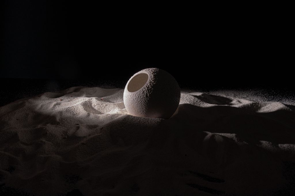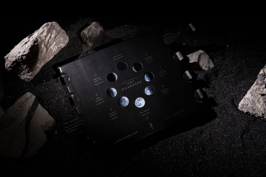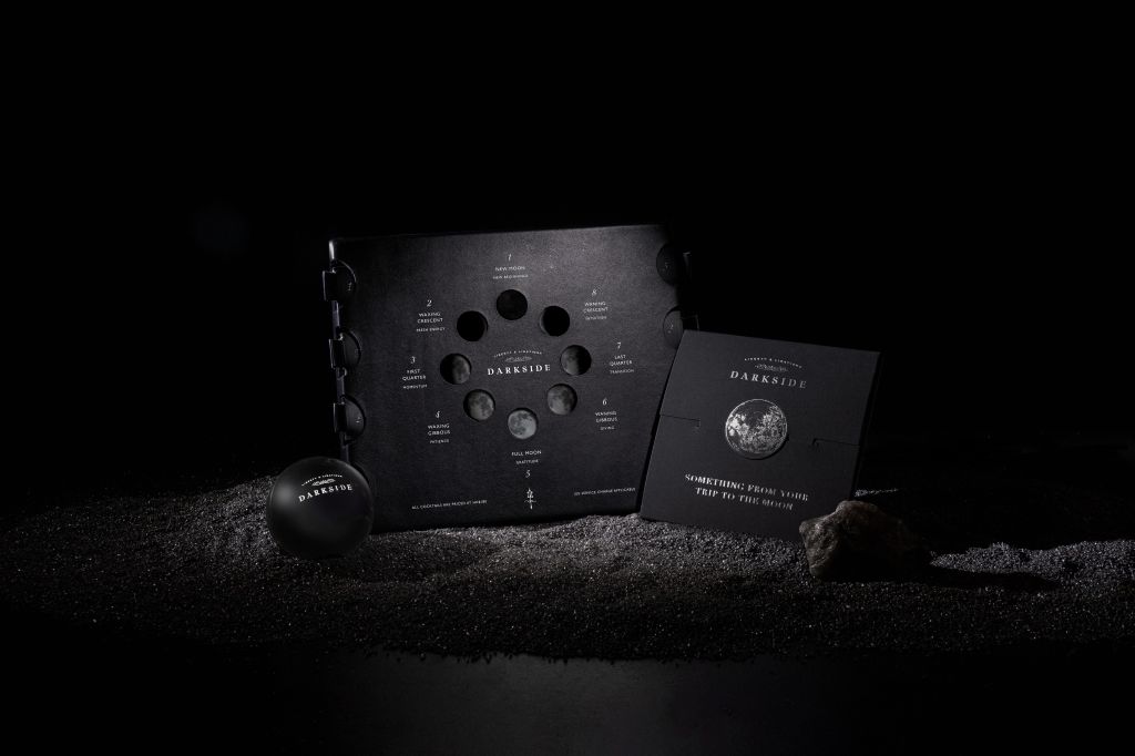 The drinks, while complete in themselves, are elevated by the way they are presented. Australian artist Ryan Foote, whose design studio in Melbourne is focused on delivering unique and contemporary ceramic tableware and drinkware, teamed up with DarkSide to create a series of porcelain vessels that convey the dark side of the moon while also tantalising the visual, tactile and taste sensations of the cocktails. He fashioned three special cups for The Moon Menu experience — one inspired by moon craters, one by the actual moon and one by the universe’s meteorites.