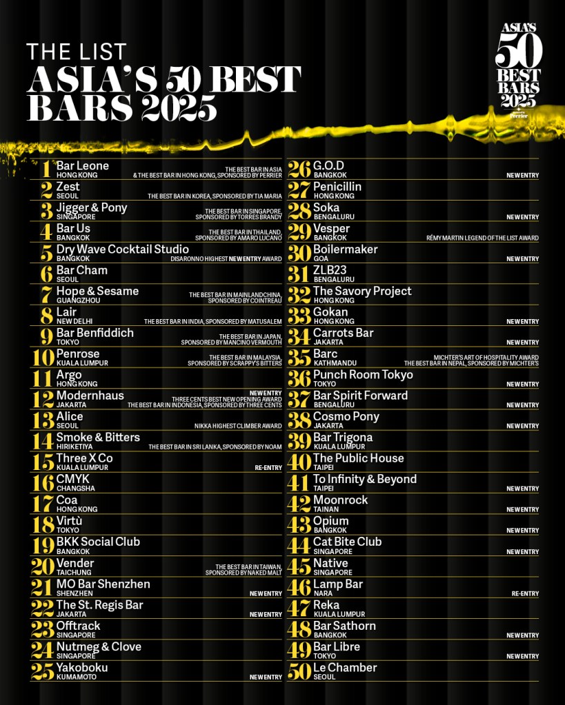 The 2025 rankings tell a story of change: 28 bars, representing close to a third of the entire list, made their debut in the top 100, including 12 new bars that broke directly into the top 50 without following the traditional progression through lower rankings.